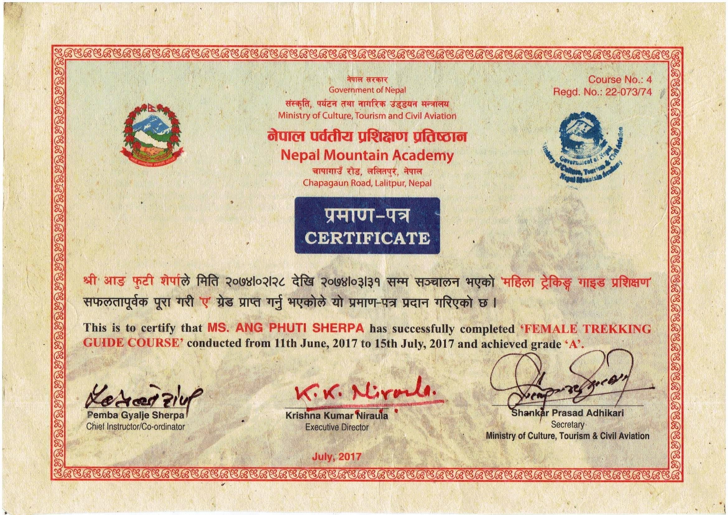 She has been done of trekking Everest base camp trek, Ranjo pass Gokyo trek , 3 passes trek Everest base camp trek, Everest base camp trek , Climbing Mera peak summit 6476m and Annapurna base camp trek