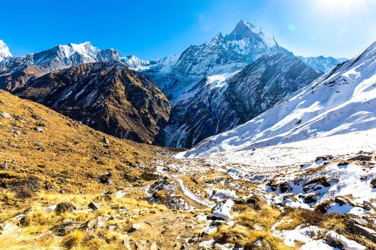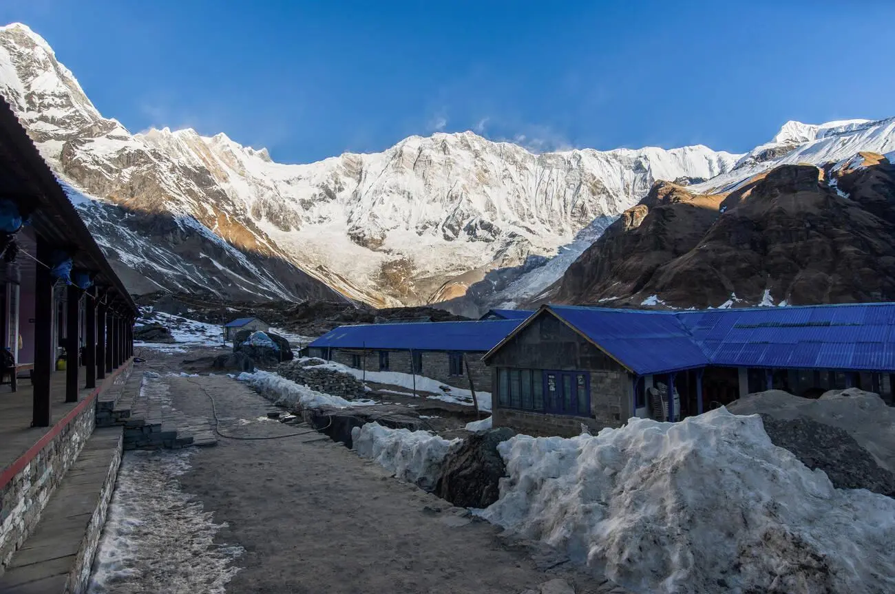 Continuing your journey towards Annapurna Base Camp, today's trek takes you from Dovan to Machhapuchhre Base Camp (3,700 meters). The trail ascends gradually through lush forests and rugged terrain, offering glimpses of Hiunchuli (6,441 meters) and Annapurna South (7,219 meters). As you approach Machhapuchhre Base Camp, also known as MBC, you'll be surrounded by towering peaks and spectacular landscapes. After approximately 6 hours of trekking, you'll reach MBC where you'll spend the night. Overnight stay at a lodge in Machhapuchhre Base Camp.