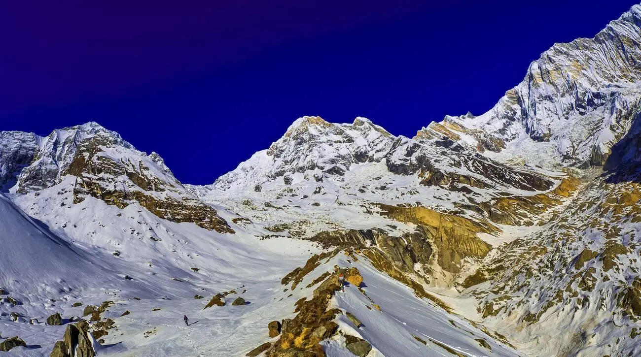 Today is the highlight of your trek as you journey to Annapurna Base Camp (4,130 meters), surrounded by panoramic views of Annapurna I (8,091 meters), Annapurna South, Hiunchuli, and other peaks. The trail winds through moraine and snowfields, with prayer flags fluttering in the wind. Upon reaching Annapurna Base Camp, you'll be rewarded with breathtaking views of the Himalayan giants towering above you. After approximately 4 hours of trekking, you'll arrive at ABC where you'll celebrate your achievement. Overnight stay at a lodge in Annapurna Base Camp.