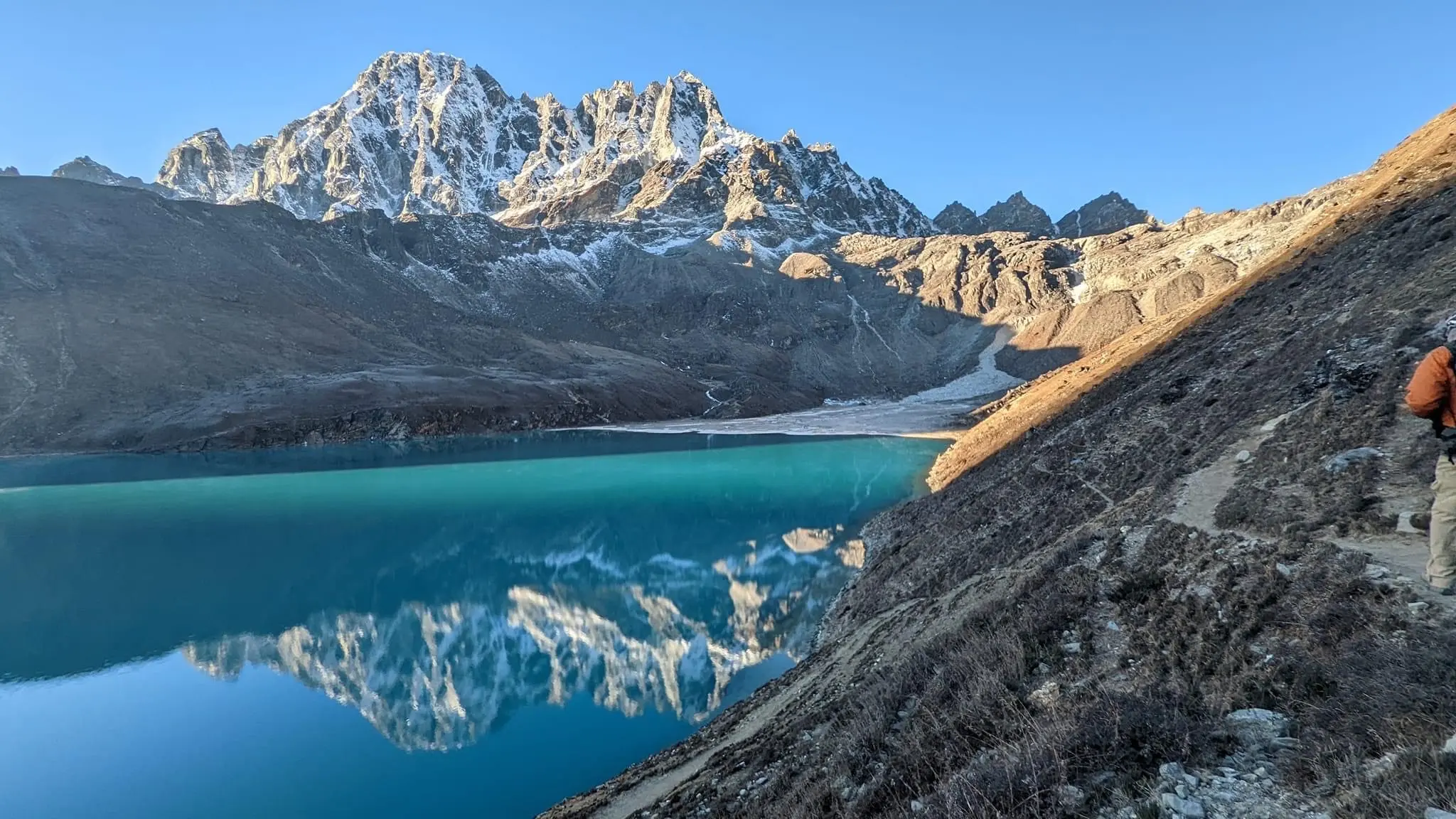Start early for the steep climb to Gokyo Ri, a famous viewpoint with one of the most jaw-dropping panoramic scenes in the Himalayas. From the summit, enjoy stunning views of Everest, Lhotse, Makalu, and Cho Oyu, along with the Ngozumpa Glacier—the largest in Nepal. After descending, you’ll continue a half-day hike towards the Fifth Lake, a serene and rarely visited area that provides a peaceful and awe-inspiring atmosphere. Return to Gokyo for the night.